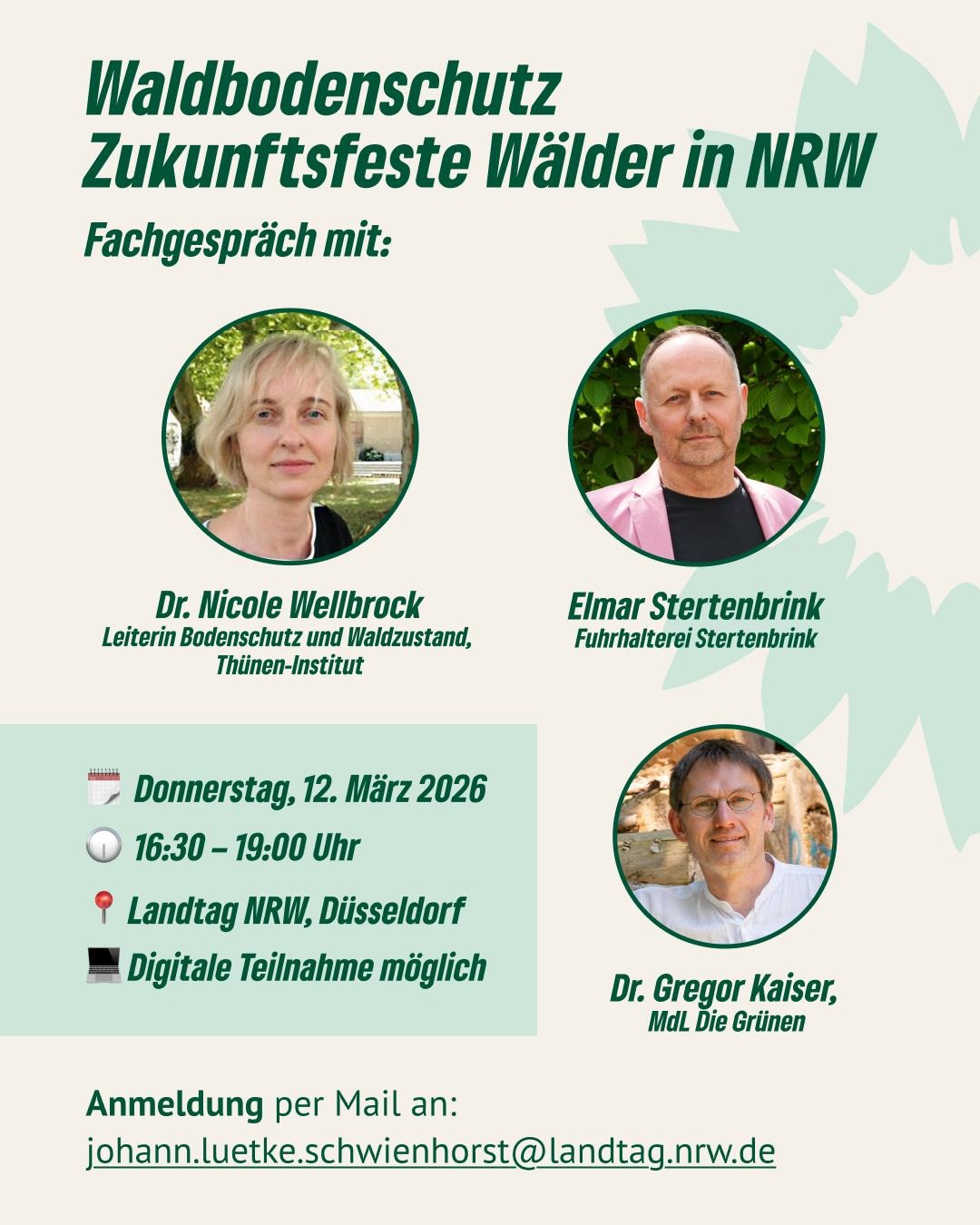 Am 12. März 2026 diskutieren wir im Landtag NRW mit Wissenschaft und Praxis über Perspektiven für einen zukunftsfesten Waldbodenschutz.