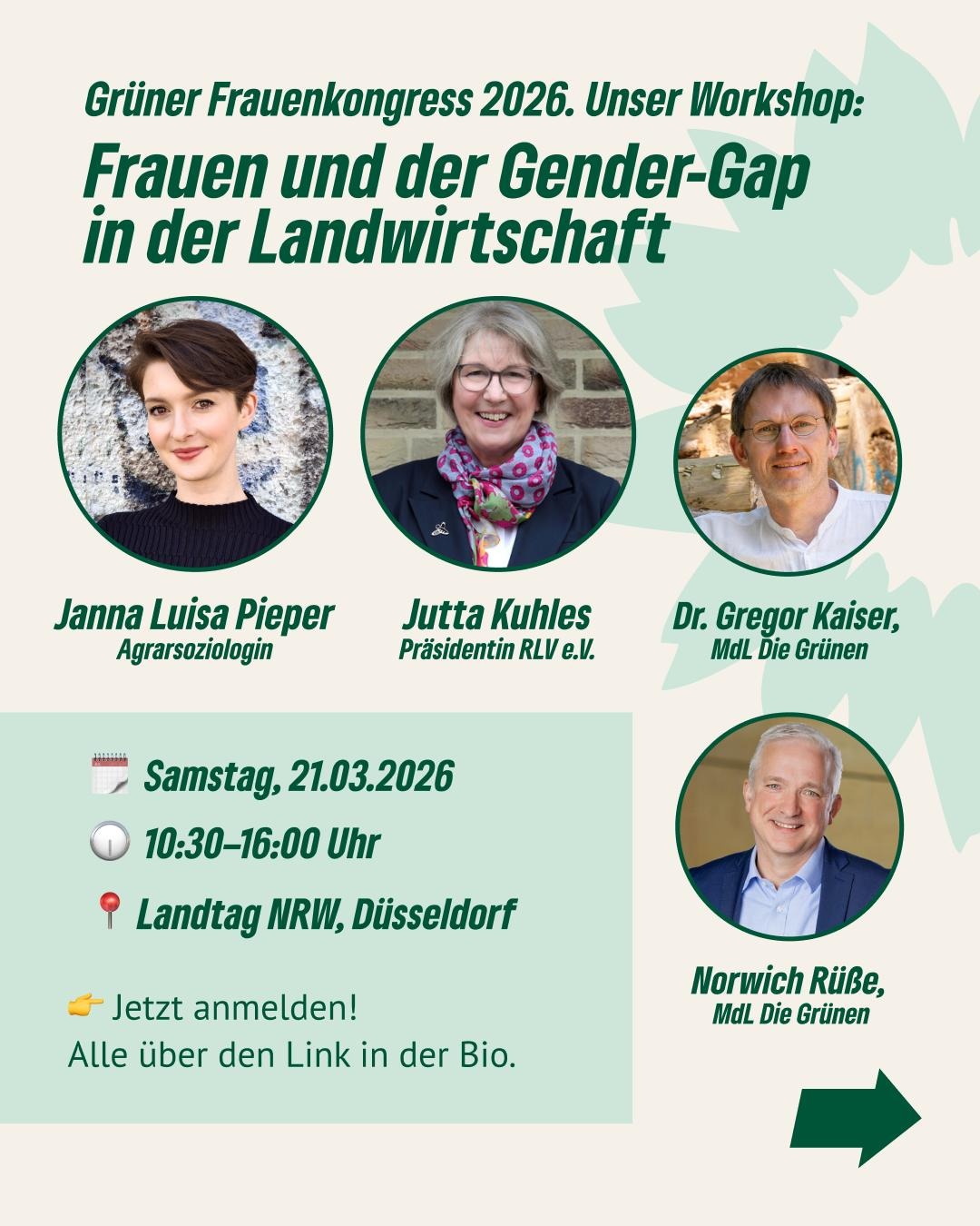Frauen und der Gender-Gap in der Landwirtschaft Workshop im Rahmen des Grünen Frauenkongress 2026 Samstag21.03.202610:30 – 16:00 UhrLandtag NRWDownload als ics-Datei