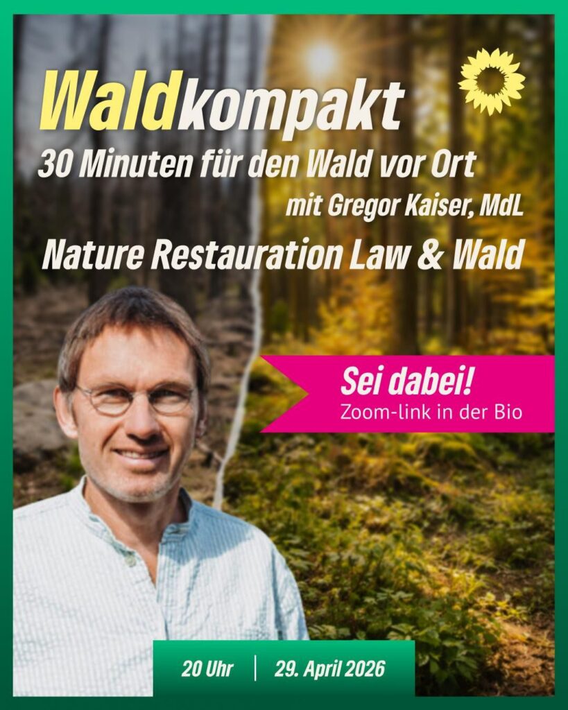 Webinar: Wald kompakt – Nature Restauration Law & Wald Hier geht’s zum Webinar: https://us06web.zoom.us/j/5329966795?pwd=ZnlvcHhLazh5RUxqZWhIU0ZyQkhtZz09 Mittwoch29.04.202620:00 – 20:30 UhrDownload als ics-Datei